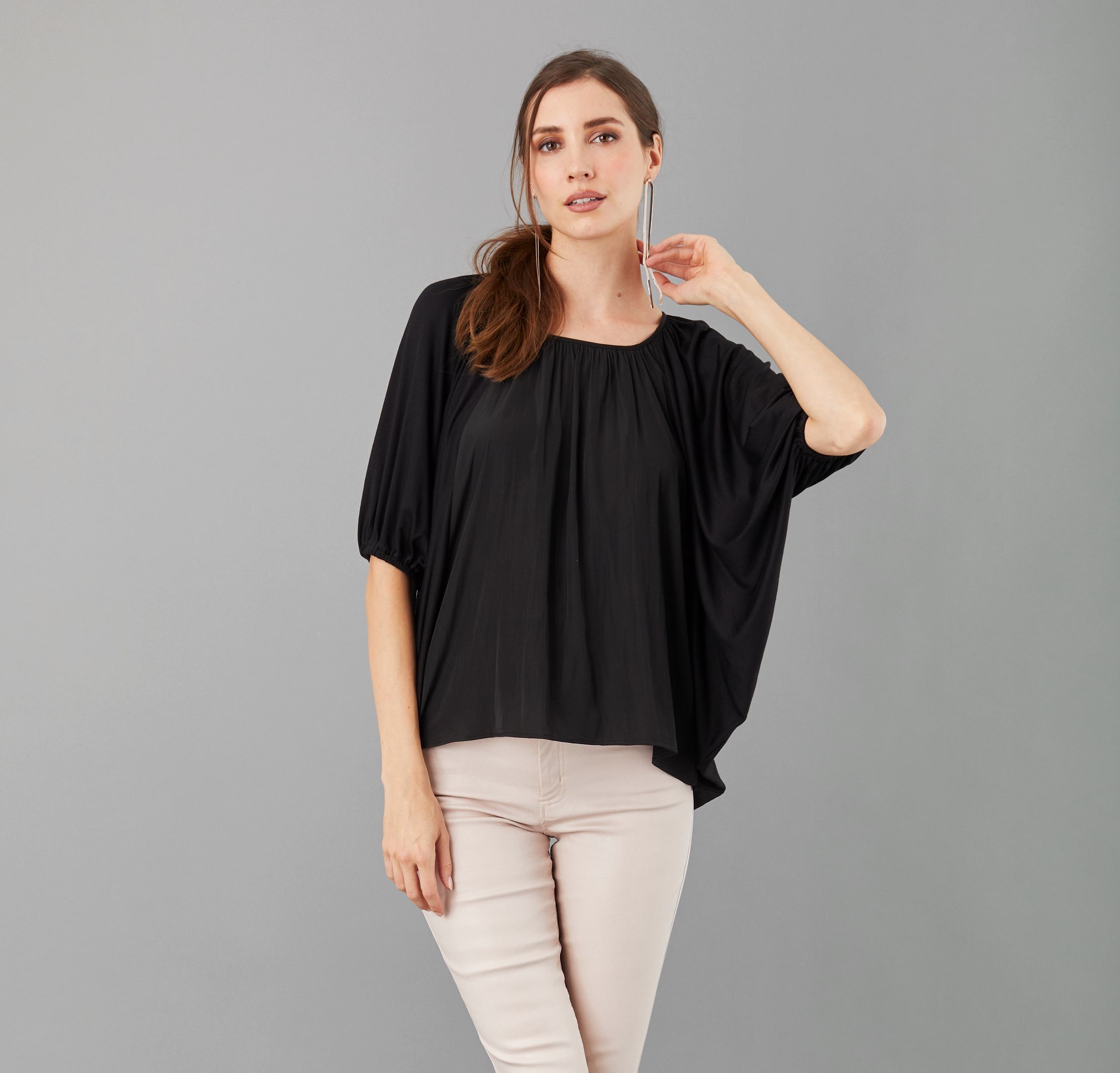 Polyester, rayon and cotton. Fits loose. Hand wash cold.