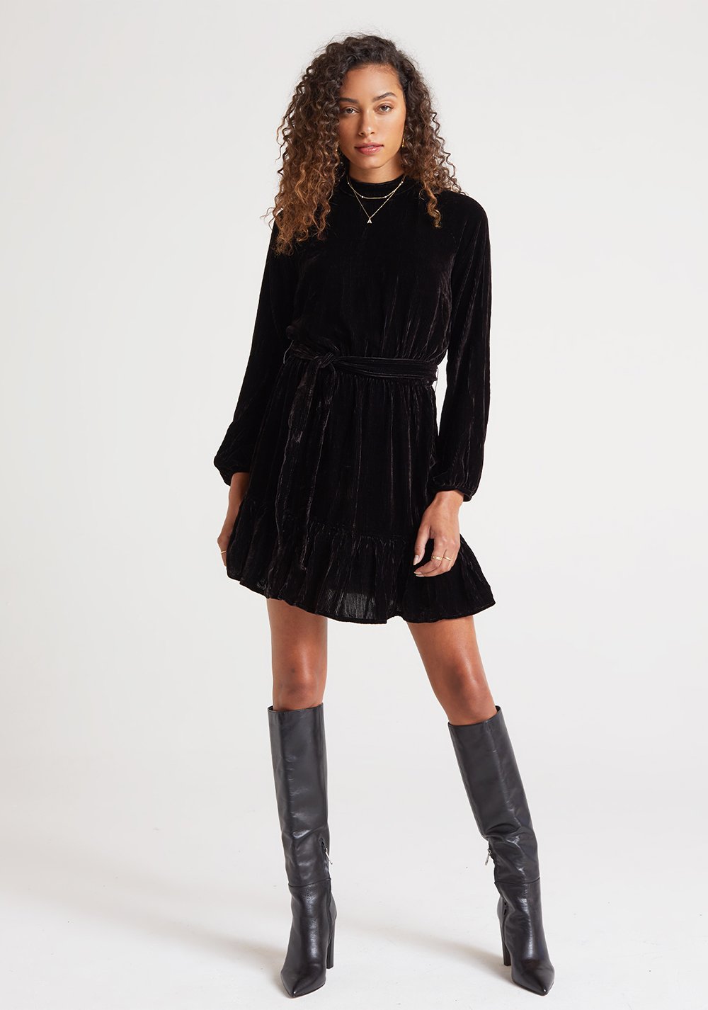 This simple yet chic high neck mini dress has an elastic belt to pull the fit tighter. Designed in a velvet corduroy fabrication. 70% Viscose, 30% Silk.