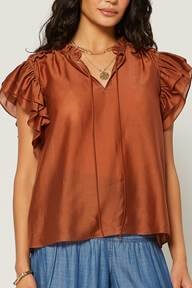 90% lyocell, 10% polyester. Fits loose. Hand wash cold.