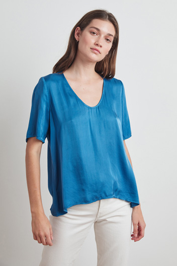 machine wash 100% viscose fabrication: satin viscose shirred back neckline
