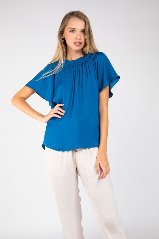 SHORT SLEEVE FLUTTER BLOUSE WITH NECK RUCHING DETAIL. 100% POLYESTER. WASHABLE. FITS TRUE TO SIZE.
