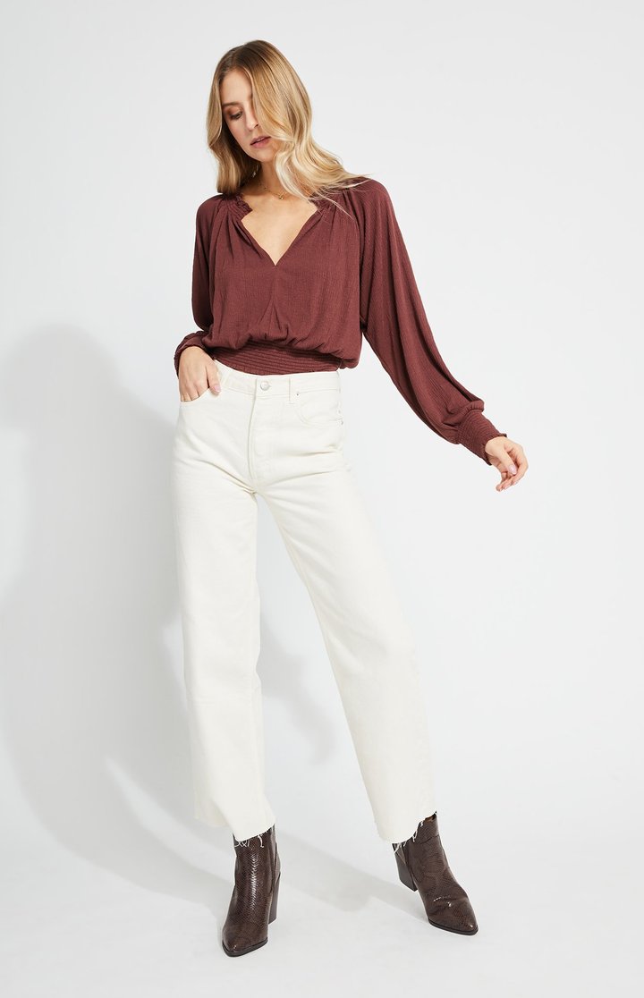 Made of a lightweight textured knit, the Brooke features smocking at the waist, sleeve cuffs, and neckline. Wear it casually, or dress it up for a date night.