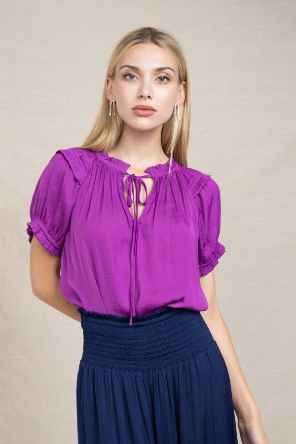Short sleeve ruffled blouse with front tie detail 100% Polyester Hand Wash Cold Model is 5'8″ wearing size Small
