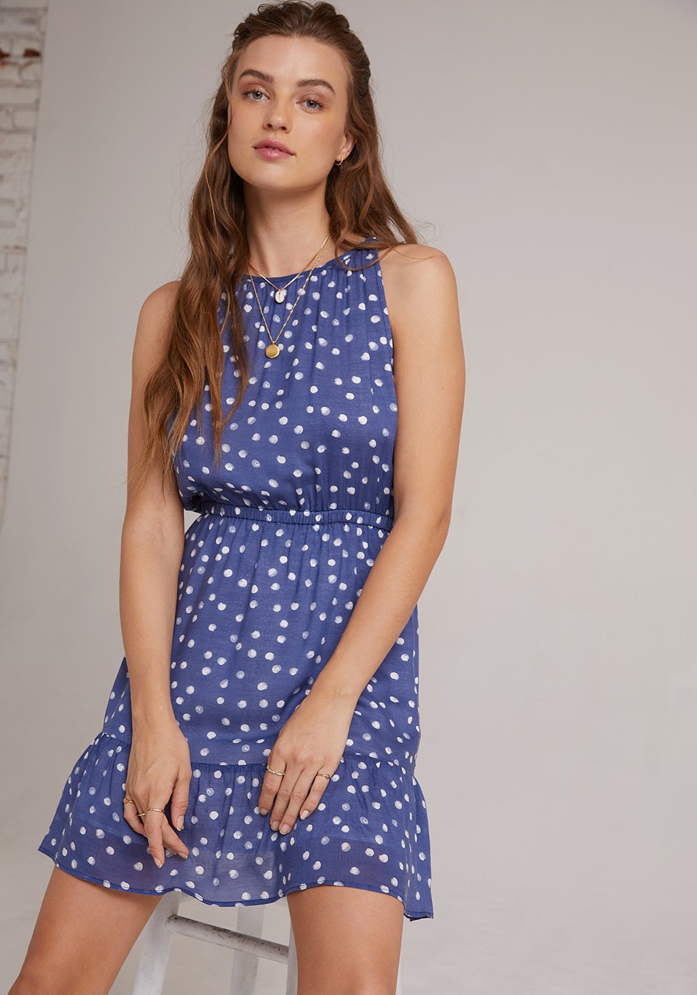 Adorably dotted. The Shirred Halter Dress is a flirty halter mini dress with a shirred waist and hemline. 100% Rayon.