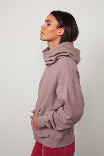 100% cotton fleece. Runs full. Turtleneck can also be a hoodie. Washable.