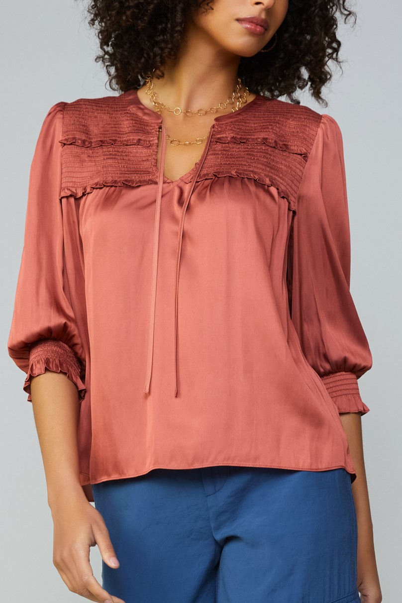 / Rosewood smocked tie neck top