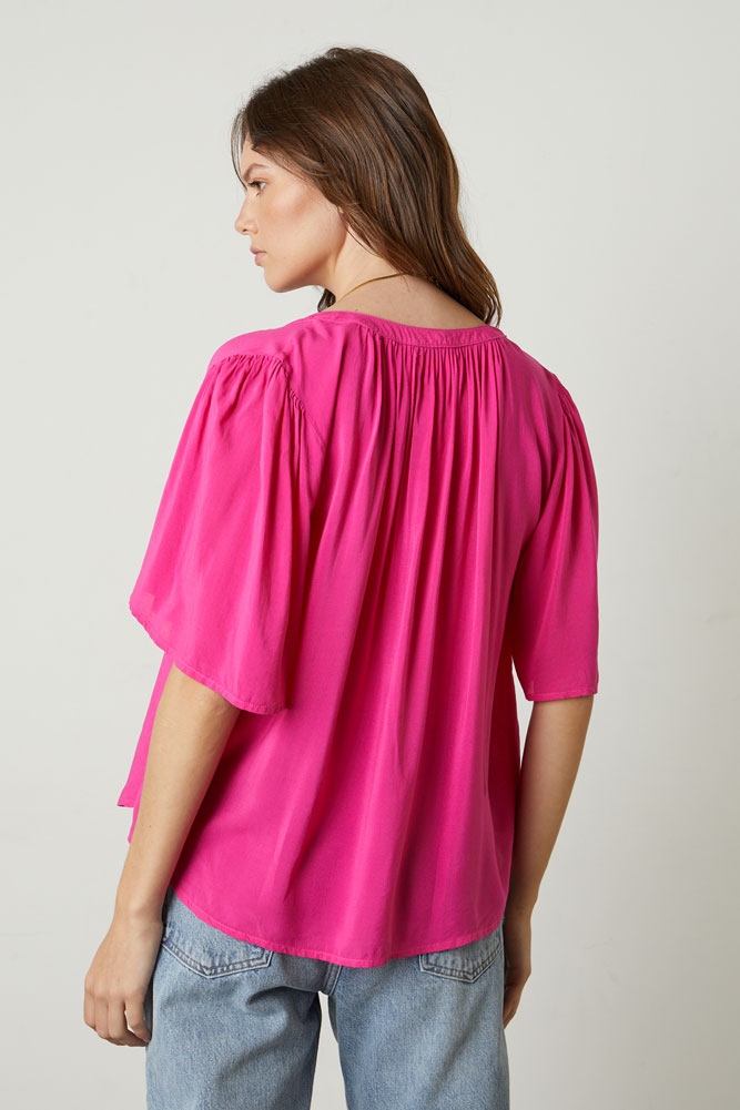 100% viscose. Loose fit. Hand wash cold. Velvet.
