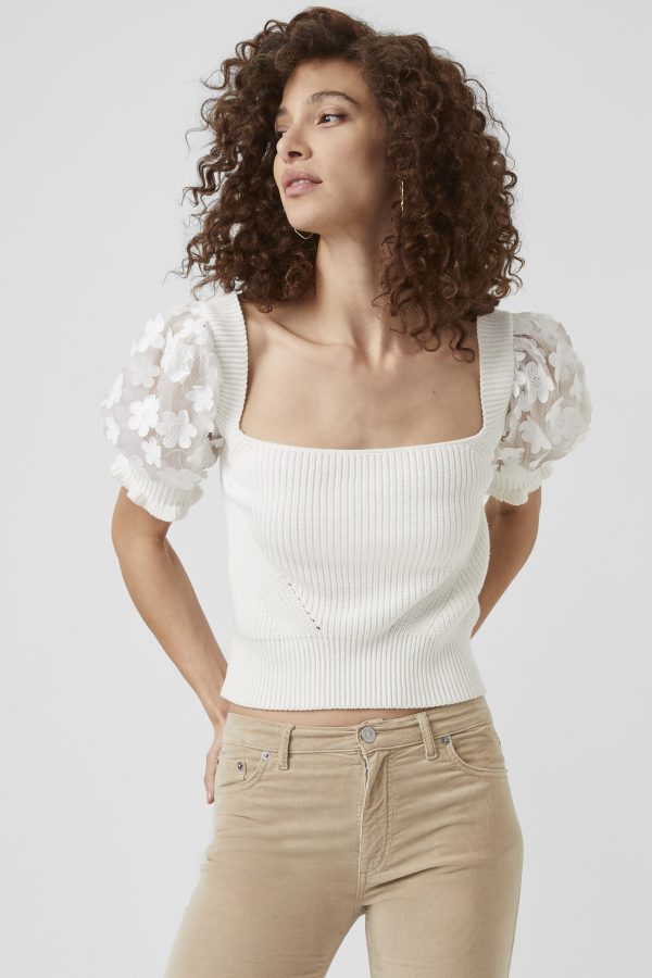 100% cotton. Organza sleeves. Slim fit. Size up. Hand wash cold.